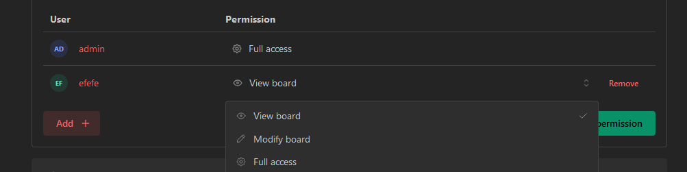 With the access control, you can permit a single user or a group to your board. The users and groups can have one of these three levels of access: