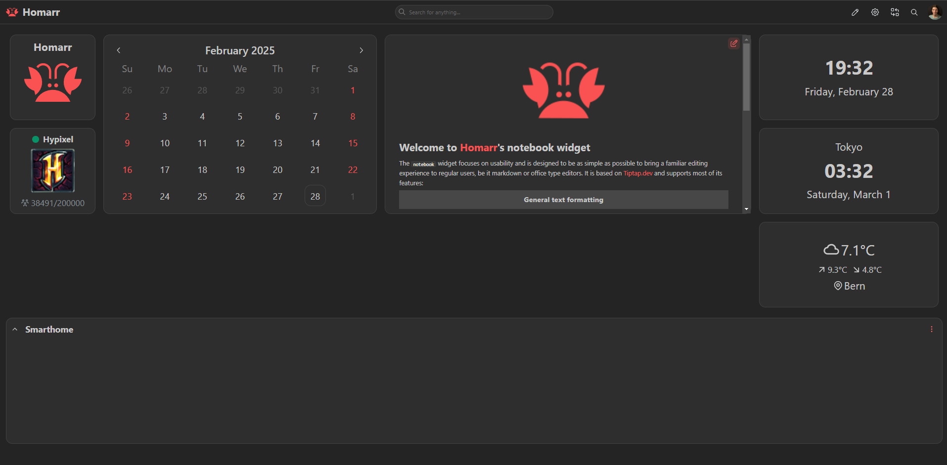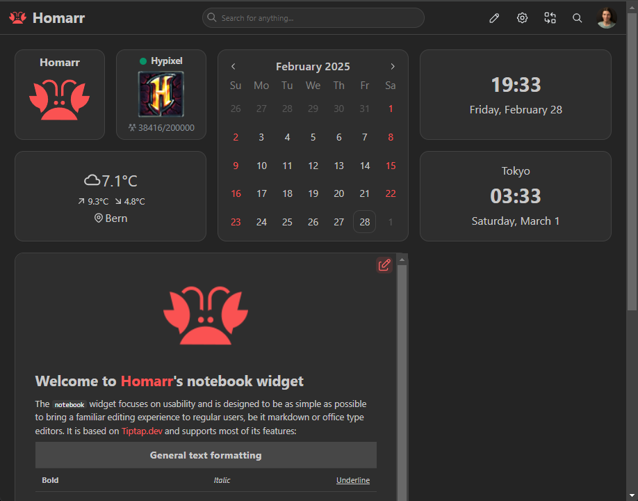 The home board is the dashboard, that will be shown at the root path of Homarr or if no board name was passed in the URL. All the following paths will lead to the home board: